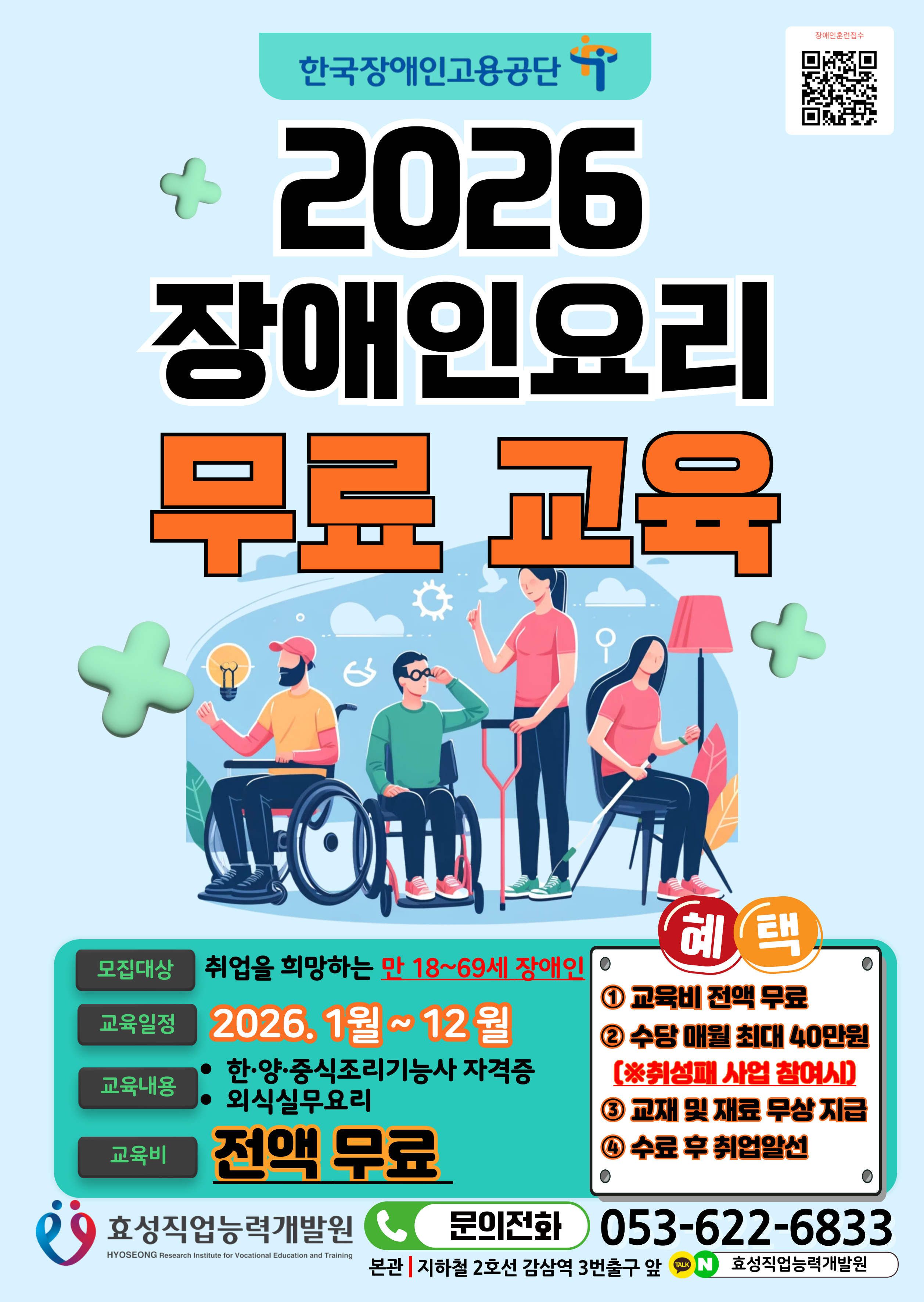 26년도 장애인 무료요리교육을 아래와 같이 추가모집하오니 많은 신청을 부탁드립니다.